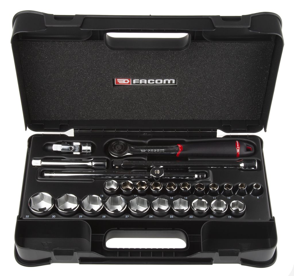 The Facom 26 piece 1/2 in Socket Set with Ratchet comes with a range of essential sockets. Designed to offer less wear, thanks to the torque being transmitted through the fastener flats instead of the corners. Also, the larger contact area between socket and fastener reduces stress but offers powerful tightening.