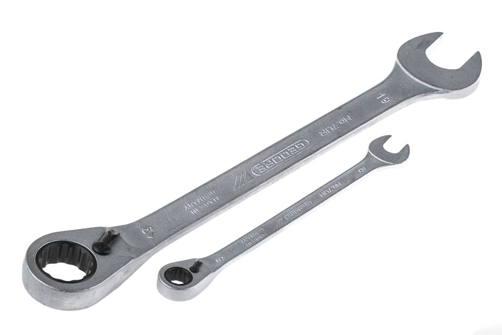 Professional combination spanners with fine toothed ratchet ring end. Supplied in a plastic case.