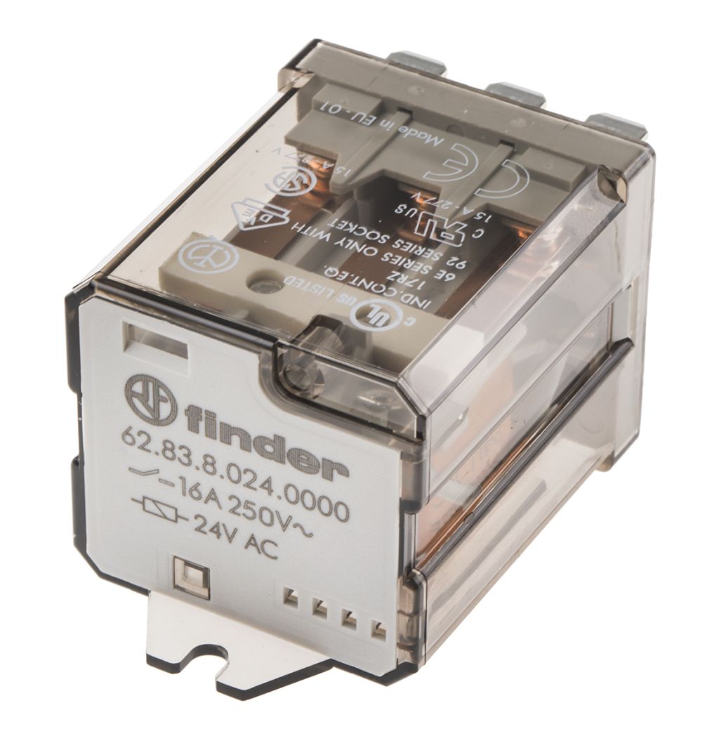 Product description Finder, 24V ac Coil Non-Latching Relay 3PDT, 16A Switching Current Flange Mount, 3 Pole, 62.83.8.024.0000