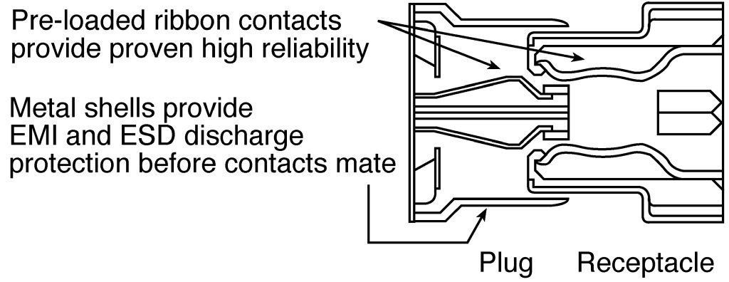 Cable mount plugs and PCB mount receptacles with pre-loaded ribbon contacts for long life