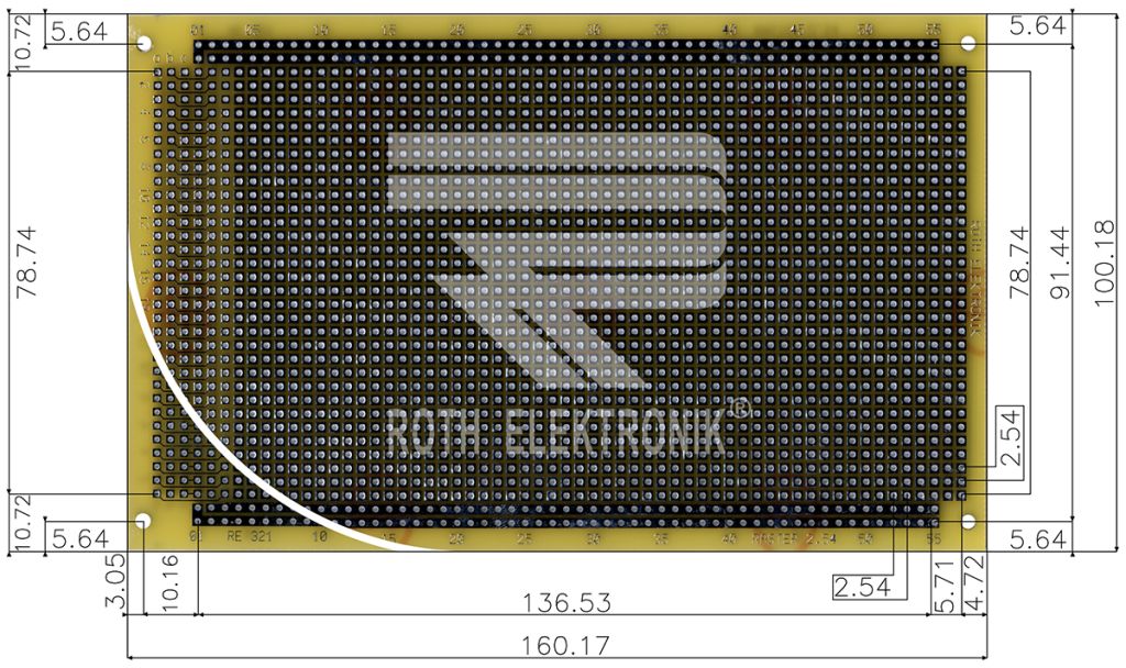 | Product description | Roth Elektronik Double Sided Matrix Board FR4 With 36 x 55 1mm Holes, 2.54 x 2.54mm Pitch, 160 x 100 x 1.5mm |