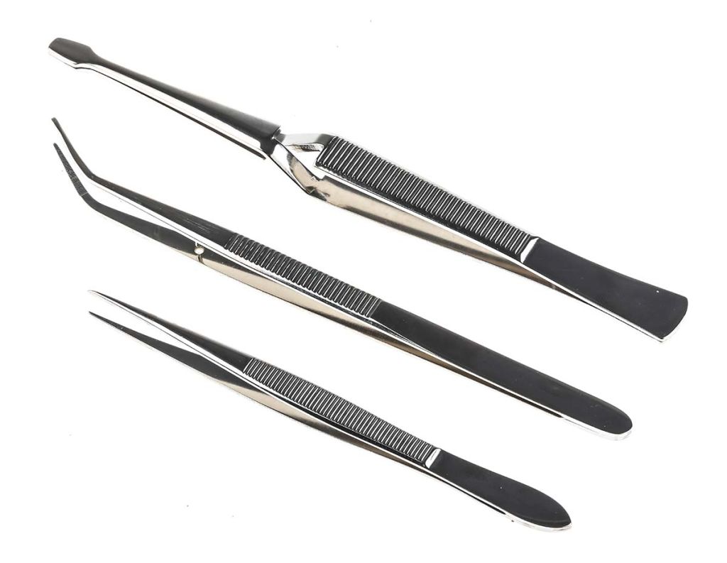 High quality 3 piece tweezers set manufactured from Steel with a Nickel plated finish for a high level of strength and corrosion protection. An excellent general purpose tweezers set supplied in a handy Nylon storage and carry pouch.