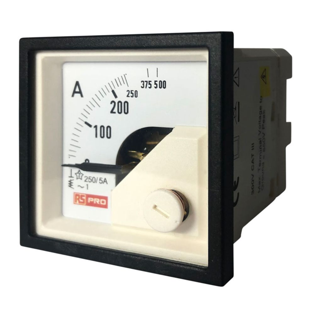 Product description RS PRO Analogue Panel Ammeter 10 (Input) A, 250/5 (CT) A, 500 (Scle) A AC, 48mm x 48mm, 1 % Moving Iron