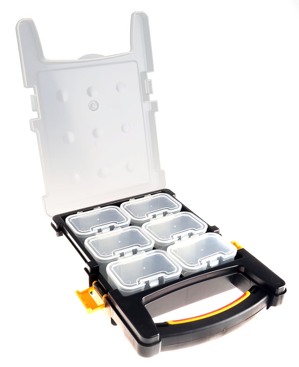 Professional polypropylene assortment case with hinged clear lid and lock. Suitable for storing small parts.