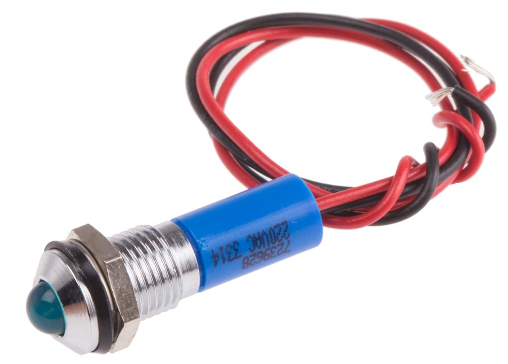 | Product description | RS PRO Blue Indicator, 220V ac, 8mm Mounting Hole Size, Lead Wires Termination, IP67 |
