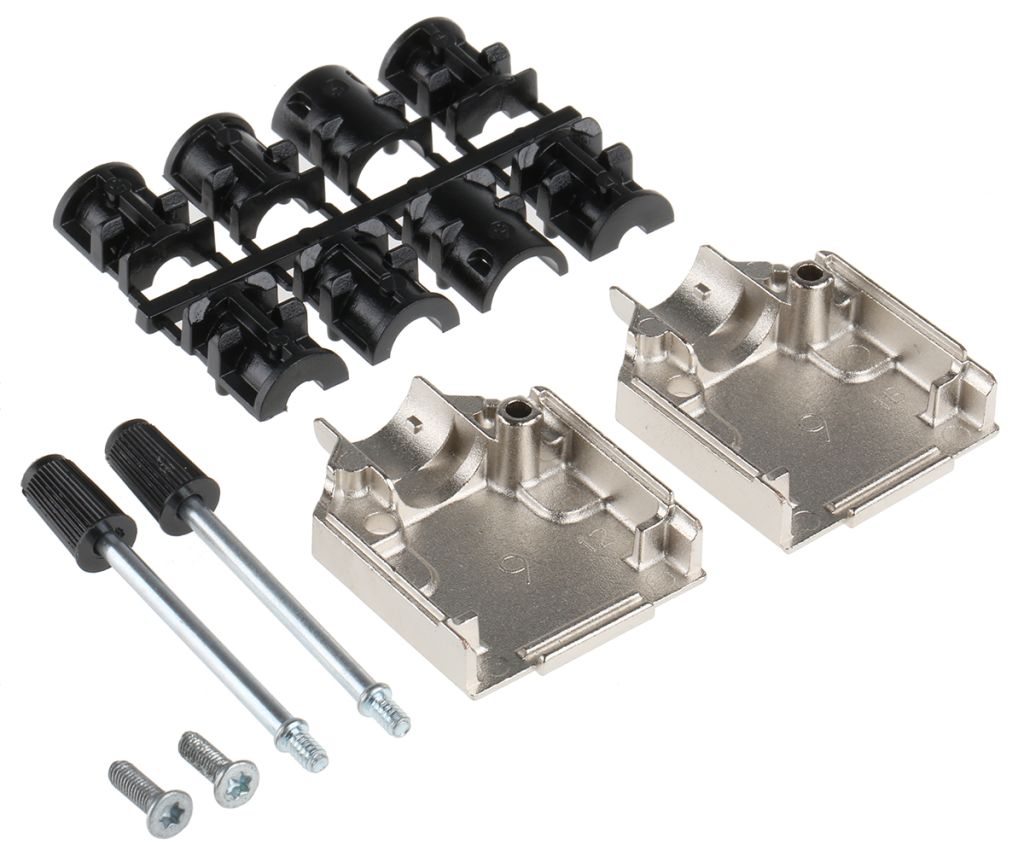 Nickel plated die-cast zinc ADK backshells come as a complete kit comprising Shells, jackscrews and cable grommets to suit 4, 5, 7 and 9mm cable diameters.