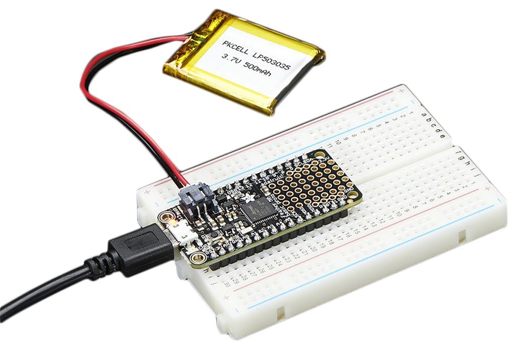 You have the option to use either a 3.7V Lithium polymer battery, or connect to a PSU via microUSB. If you choose to power your Feather HUZZAH board by battery, it makes it portable. So you can take it with you, wherever you need to. If you need to recharge it at any point, just plug it in via the microUSB and it will recharge.