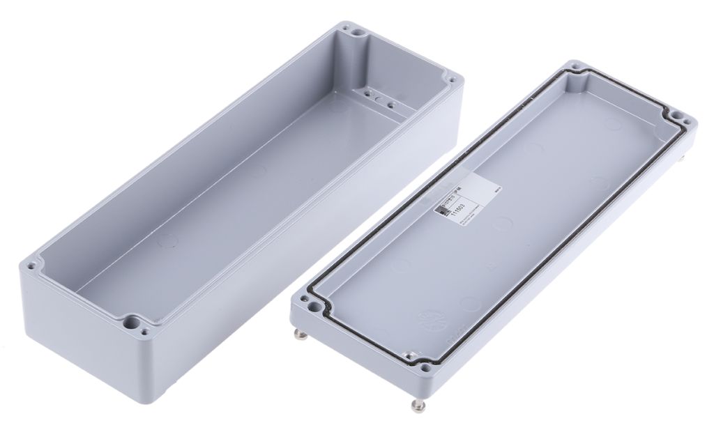The GE Series enclosures are grey (RAL 7001) powder coated and made from cast aluminium. Enclosures feature additional drilled and tapped holes for securing support rails or mounting plates. A lid is designed to be secured by captive screws for maximum security and the integrated seal guarantee high IP66 rating. The neoprene cord seal is oil, petrol and chemical resistant.