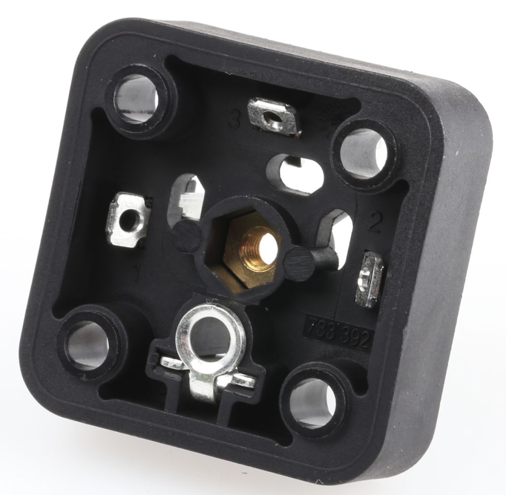 A comprehensive range of cable sockets, appliance connector bases and accessories typically for use with solenoid valves on pneumatic and hydraulic equipment. The inner connector can be rotated through 90° increments so the gland can be positioned in all four directions. Housing material is glass-filled nylon making them impact resistant.,All Hirschmann appliance connectors feature terminals that can be screwed onto bare or ferruled conductors, or will accept crimp ring/fork terminals under the head of the screw.,All are supplied complete with centre retaining screw, while plug bases are solder terminated and supplied with fixing screws. Suitable gasket to provide IP65 sealing, stock-no. 156-4729. Supplied in bags of 10