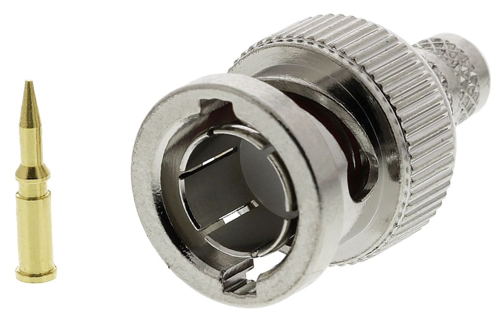 75 Ohm BNC RF coaxial plug connectors with bayonet coupling and a crimp termination. These 75 Ohm BNC straight RF coax cable crimp plug connectors have a nickel plated body, gold plated centre contacts and are for use with a variety RF coaxial cable types.