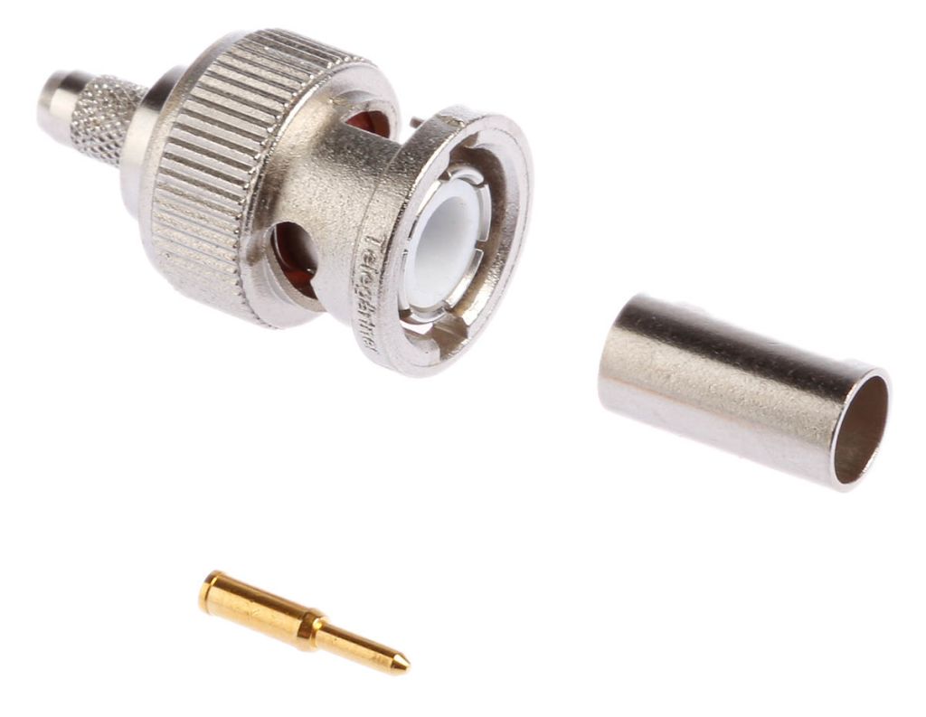 50 Ω BNC RF coaxial crimp plug connectors with bayonet coupling and a crimp/crimp professional coaxial termination. These 50 Ω BNC straight RF coaxial cable plugs have a PTFE insulator, nickel plated body, gold plated centre contact. The BNC connectors are suitable for use with various RF coaxial cable types.