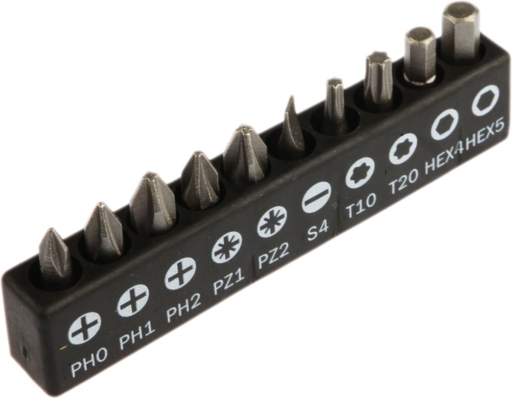 There are 10 screwdriver bits supplied with IXO V and these are PH0, 1, 2, PZ1, 2, SL4, T10, 20, Hex 4, 5.