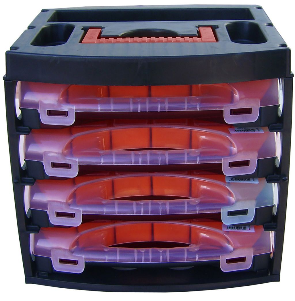 RS PRO Handy32 storage and transport box containing 4 compartments for the storage of small parts and components. Supplied with 4 cases each containing 16 removable inserts. Constructed from Polypropylene for flexibility and strength, transparent lid to make selections easier.