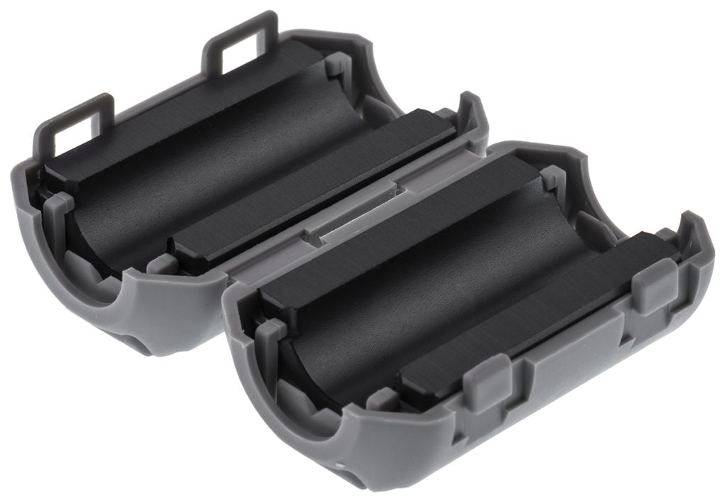 These split ferrite cores reduce the electromagnetic interference from being induced in or radiated from data and power cables. High attenuation ratings are achieved with the housing design and the special process steps during the ferrite manufacture. The special snap lock makes the ferrite sleeve suitable for use with a variety of cable diameters and once the split ferrite is locked it cannot be opened accidentally.The outer housing is designed to protect the halves of the core from breakage and ensures simple assembly on to cables that are already installed or which have been fitted with connectors. Fixing to the cable with glue or cable tie is optional. Typical applications for these split ferrite cores include data or power lines used in computer technology, terminals, industrial controllers, medical engineering and office machines.