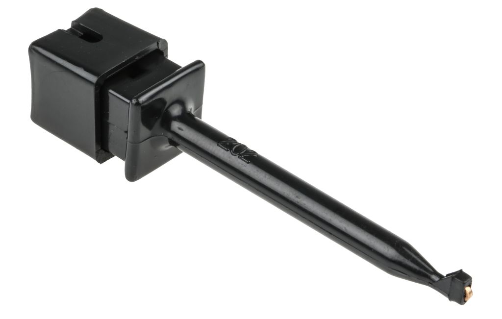 Grabber or plunger clips with a spring-loaded hook for attaching to delicate component leads and terminals. These grabber or plunger clips can connect to components with up to 0.060" diameter. The cap and body of these grabber clips are made from glass filled nylon with a stainless steel spring. Stock numbers 714-8112 and 714-8121 are 63mm in length and stock numbers 714-8124 and 714-8128 are 88mm in length.