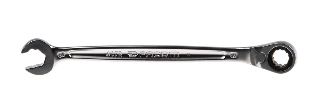 Introducing the 2 in 1 combination spanner from Facom’s 467R range, designed and created by industry professionals as a versatile tool that can be used in a variety of applications and tasks. The range of ratchet spanners was designed with the user in mind, focusing on ergonomics and providing solutions to the main pain points of standard ratchet spanners. This combination spanner has ratchet ring end and open end with a ratchet action when fully engaged and provides a built-in switch that avoids accidental reversing and ensures a secure fit. It complies with the highest levels of standardisation to ensure it is fit for use in everyday environments like a garage, plumbing or maintenance tasks and therefore makes it an essential piece in any toolbox.