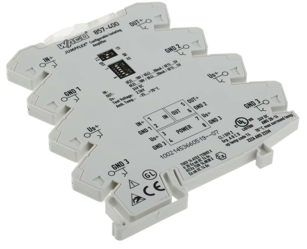 Wago 857 series JUMPFLEX configurable isolation amplifiers convert, amplify, filter and electrically isolate standard analogue signals.