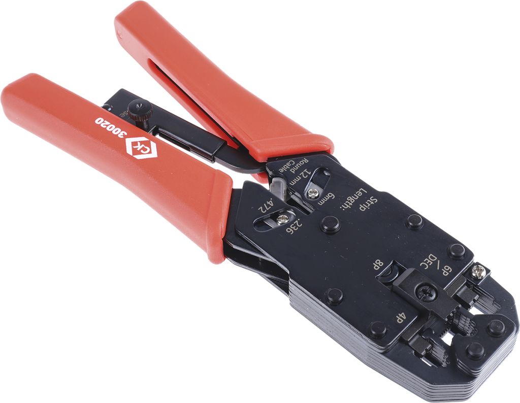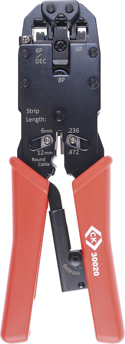 C.K. Ratchet Crimping Pliers have been designed with professionals in mind for the safe and secure crimping of RJ9, RJ11, RJ 11 DEC, RJ12 and RJ45 modular plugs. Heavy-duty frame and jaws made from hardened steel, offer a long life and hassle-free operation. Handles guarantee an anti-slip, safe and comfortable grip.