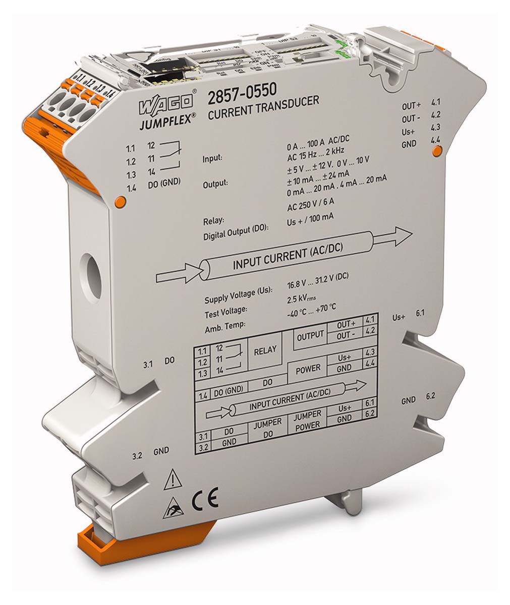 Wago 2857 series current signal conditioner measures AC-DC currents up to 100 A, while converting the measured current into an analogue standard signal at the output. Providing both digital signal output and relay with changeover contact.
