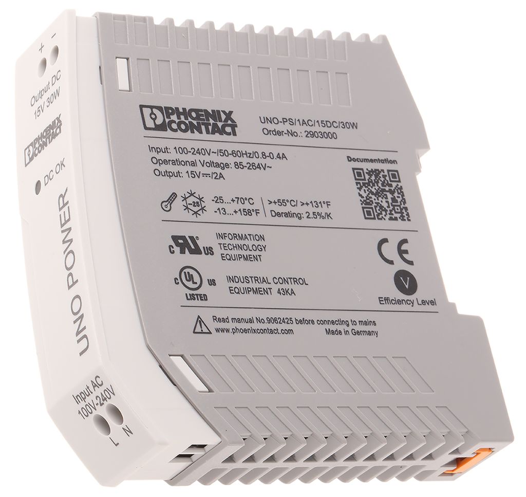 | Product description | Phoenix Contact UNO-PS/1AC/15DC/30W Switch Mode DIN Rail Power Supply 85 → 264V ac Input, 15V dc Output, 2A 30W |