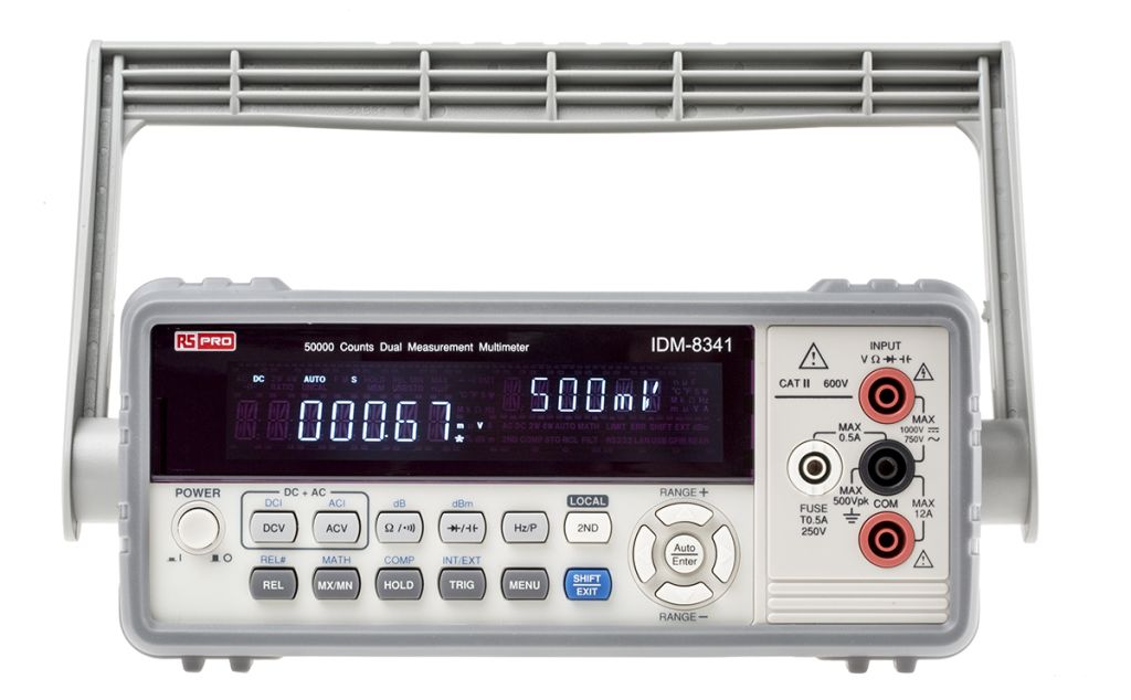 RS PRO IDM-8300 Series bench digital multimeters (DMM) include 50 000 counts, VF (vacuum fluorescent) dual-display, 0-02% basic DC voltage accuracy and a USB protocol connector. These features provide users with measurement precision, comprehensive data observation and the convenience of a connection to a PC.