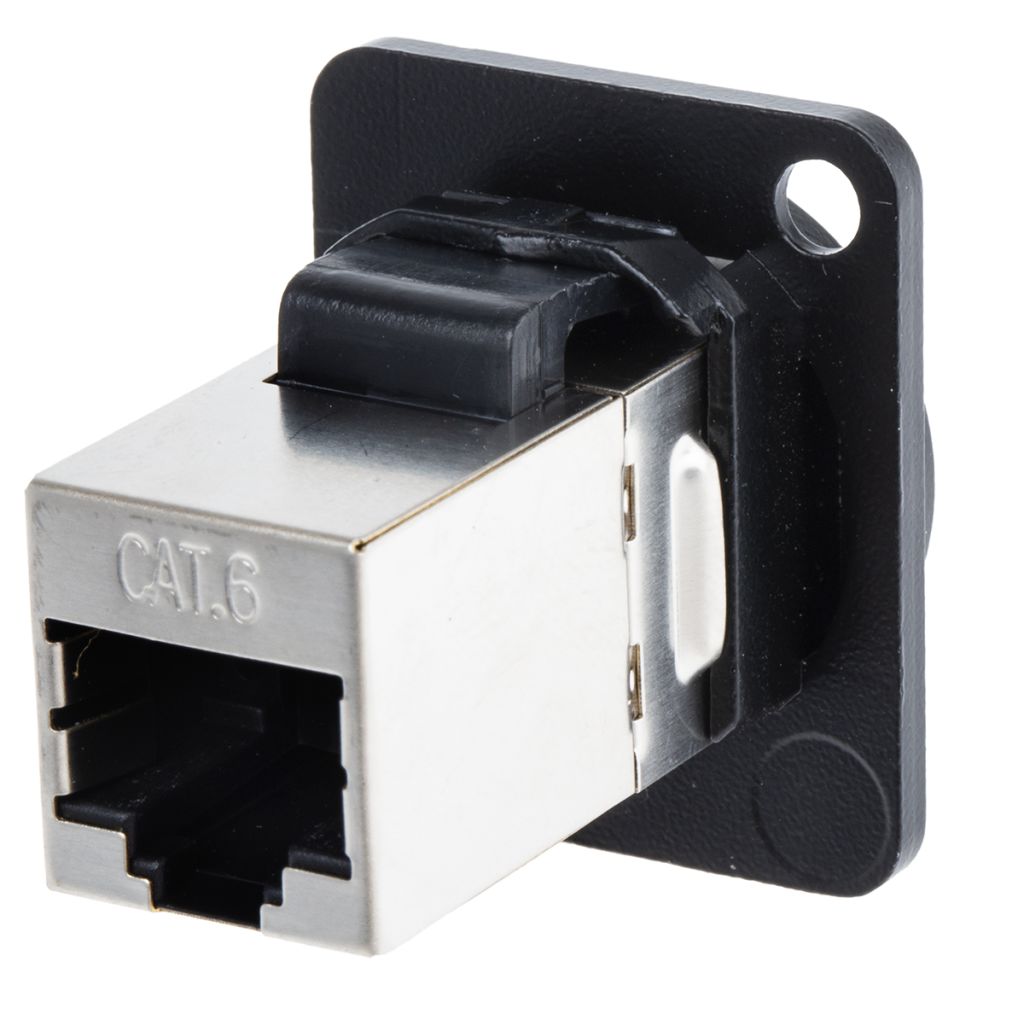 Stock No. 907-5668 is a Shielded Cat6 RJ45 to RJ45 Feed through Connector for XLR chassis, with Countersunk Screw holes