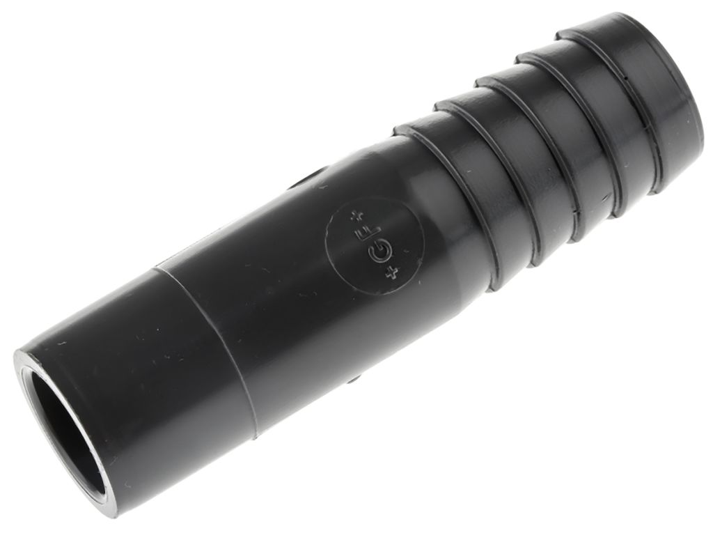 Hose connector PVC-U with solvent cement spigot metric and parallel hose connection. Suitable for use in the microelectronics, water treatment, ship building and chemical processing industries