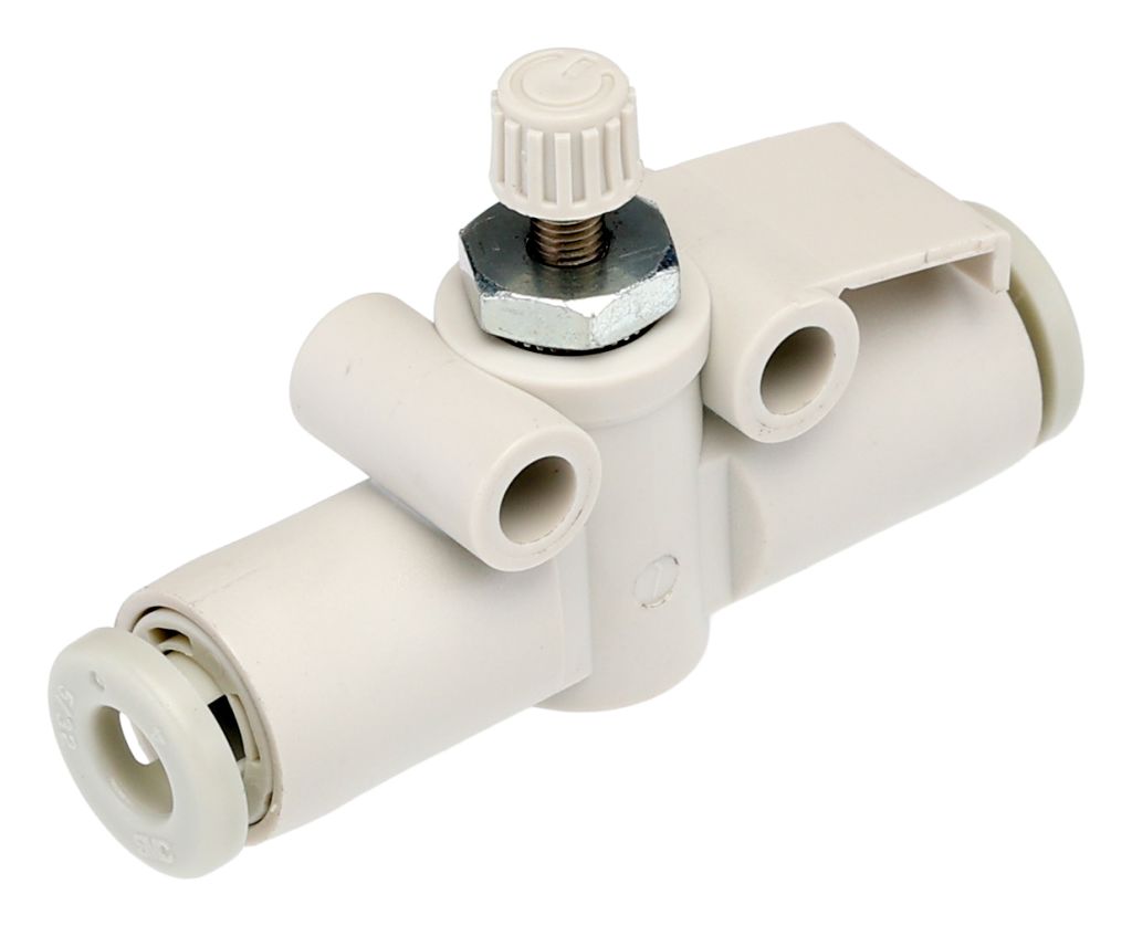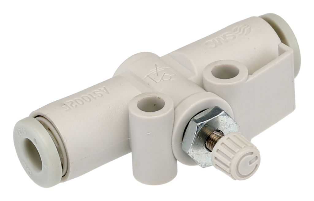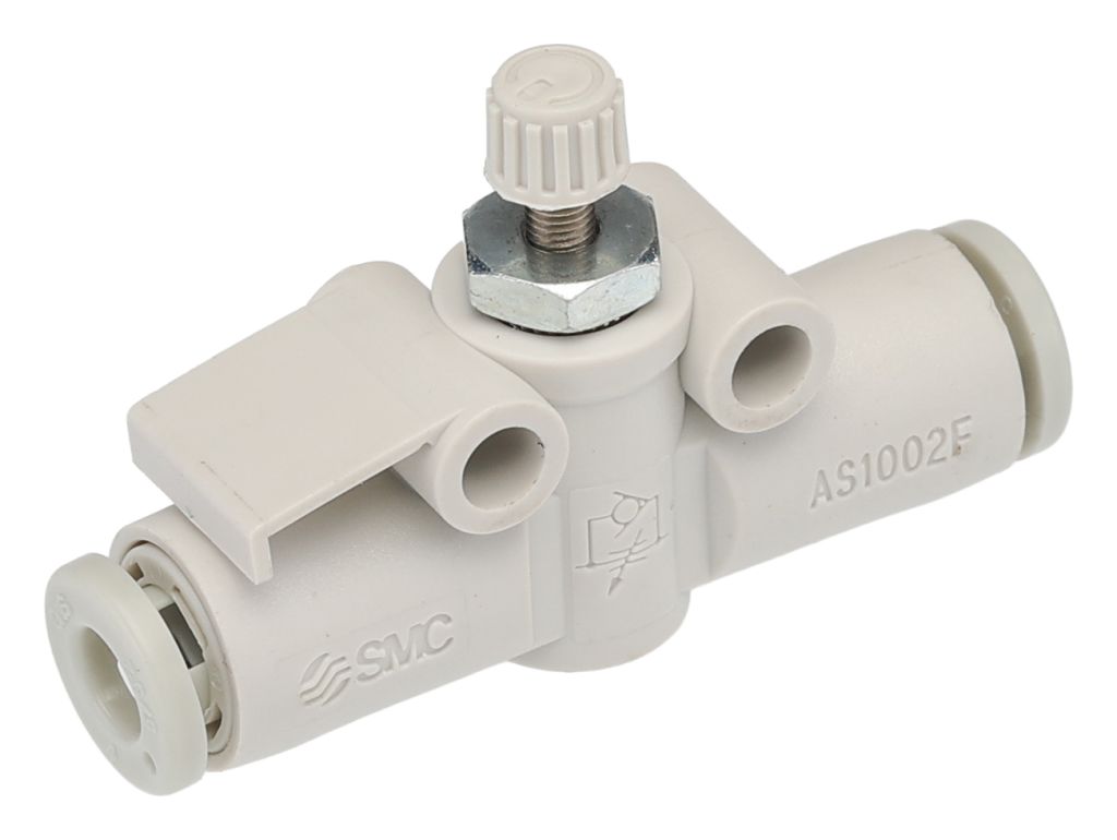 AS series inline speed controllers from SMC. This series is lightweight and has the benefit of index plates to help identify points when multiple controllers are installed. AS inline flow controllers can be mounted in four different ways so can be used in various installations.