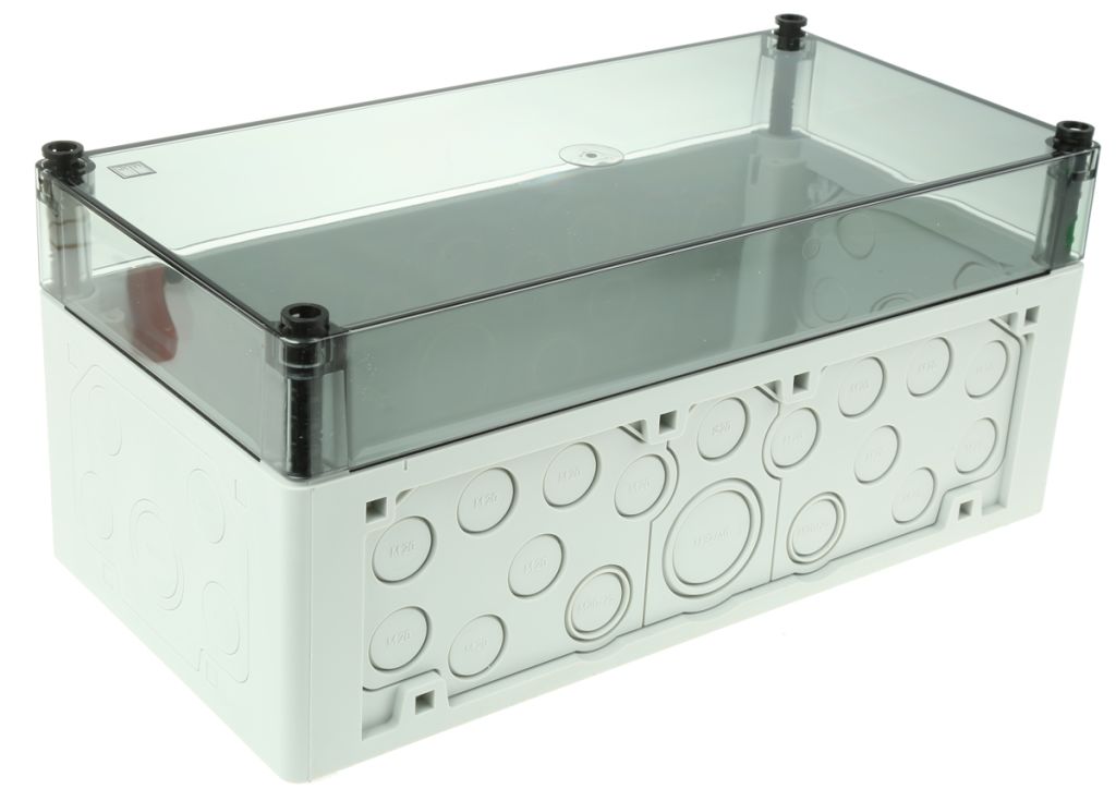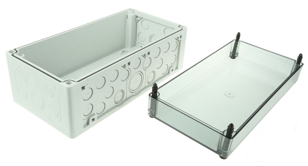 Internal base has stand-off pillars to facilitate mounting DIN rails and mounting plates