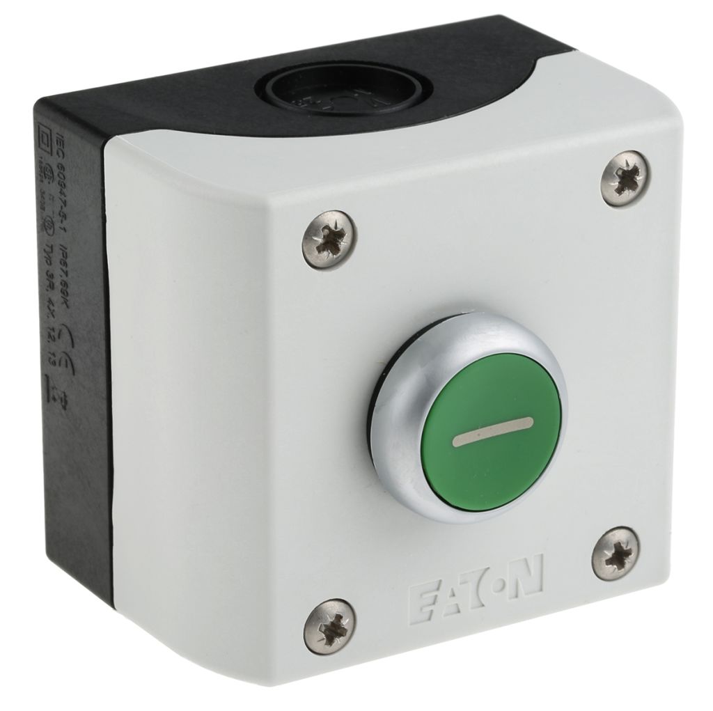 Eaton Momentary Push Button Control Station – SPDT, Plastic, 1 Cutouts, Green, I, IP69K