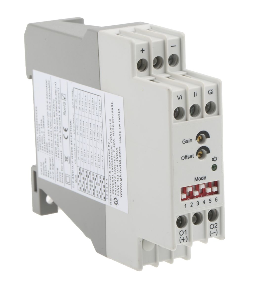 Signal transducer with configurable input/output configuration that can be selected via DIP switch combinations.