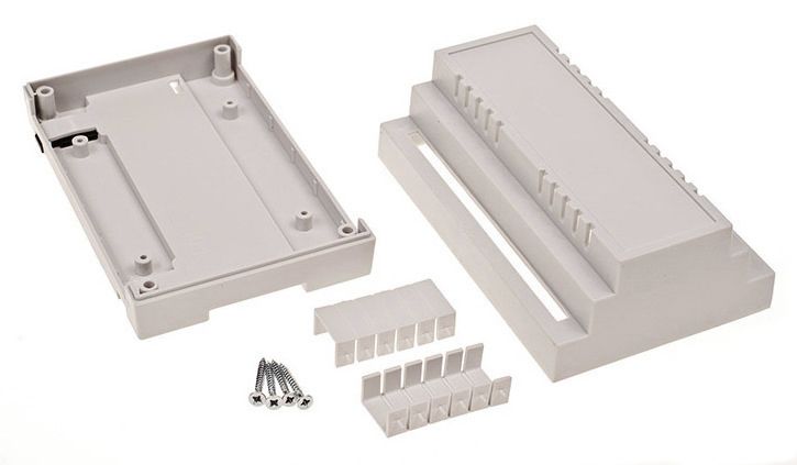 DIN rail instrument enclosures provide perfect protection from dust and moisture of internal electrical parts and components that are required to be mounted to a DIN rail. This form of enclosure is ideal for when space is limited or restricted. An enclosure mounted to a DIN rail allows PCB (printed circuit boards) and other standard electrical components to be safely installed and protected at all times, reducing the risk of damage and deterioration. Enclosures for DIN rails are also compatible with a range of accessories such as panel blanking, hooks and screws for easy installation.