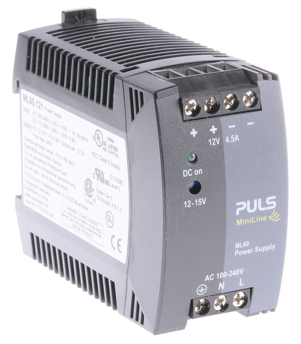 | Product description | PULS MiniLine MLY DIN Rail Power Supply 100 → 240V ac Input, 12V dc Output, 4.5A 54W |