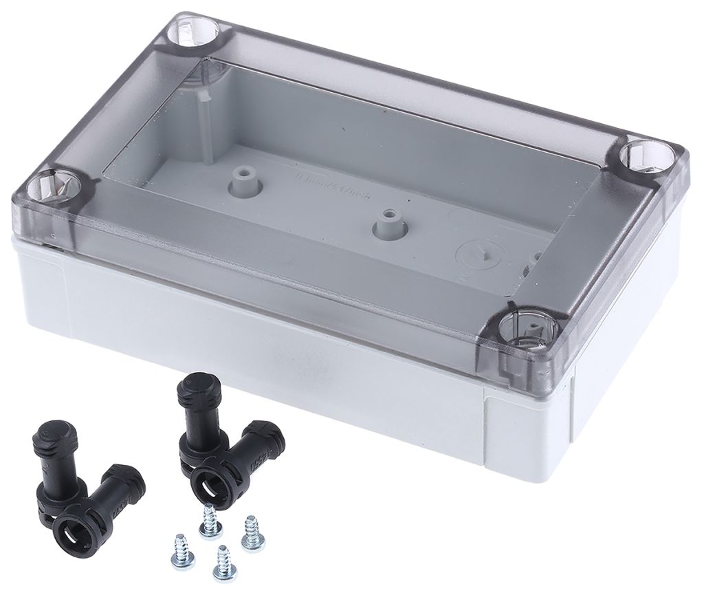 MNX Enclosures are light grey (RAL 7035), with a flammability rating of UL94-V2. Termperature range of the enclosure material is -40 → +120 °C, (+80 °C for continuous use).