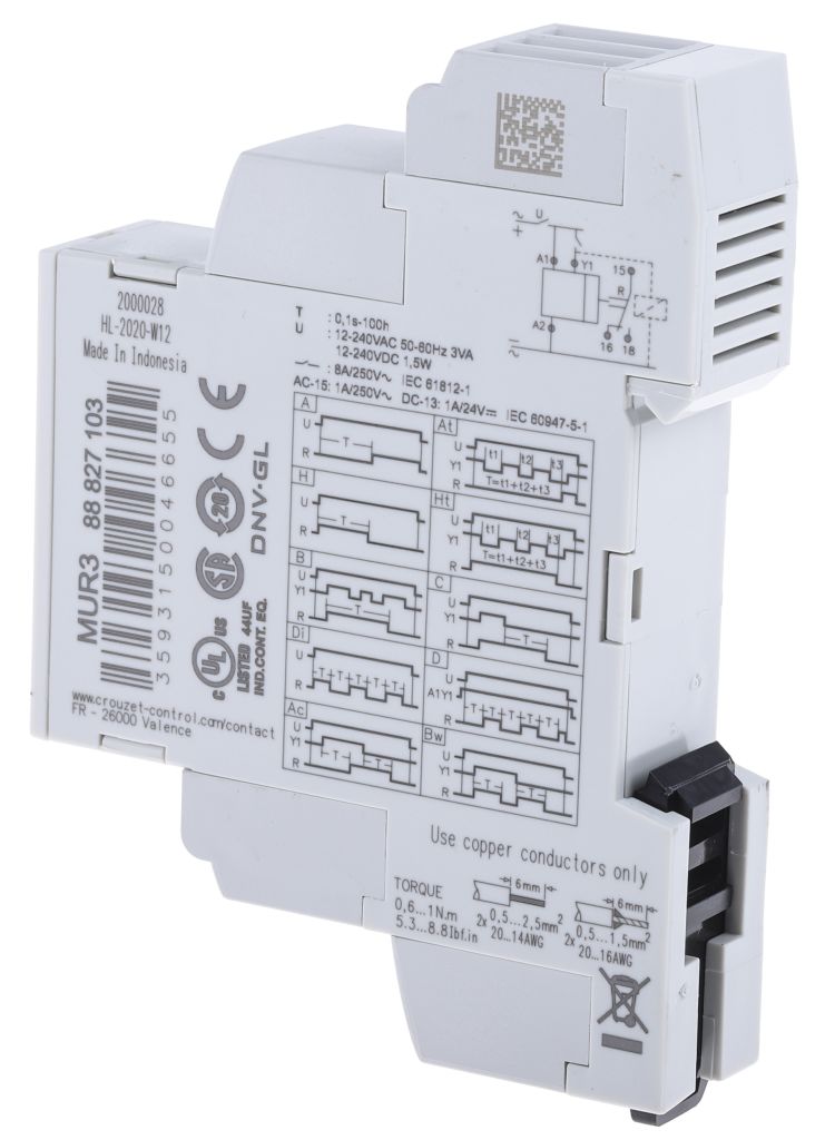 | Product description | Crouzet SPDT Multi Function Timer Relay, 12 → 240V ac/dc 0.1 s → 100h, DIN Rail Mount |