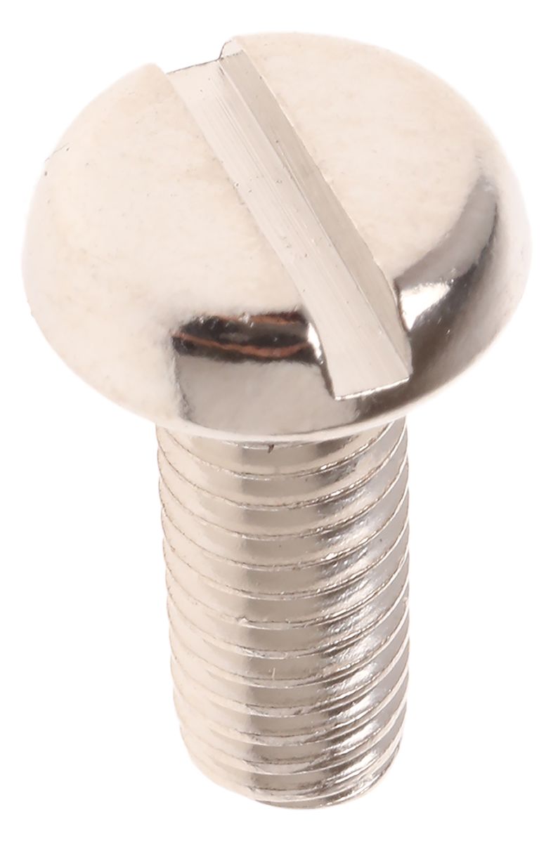 From RS PRO a high-quality slotted pan head machine screw with a metric thread. This pan head machine screw is made from high-quality nickel plated brass which has resistance to corrosion and moisture making it ideal for exterior use. The nickel plating on this screw prevents tarnishing and provides a hardened surface. These screws are also known as switch box screws as they are commonly used as fasteners for electrical switches and sockets.