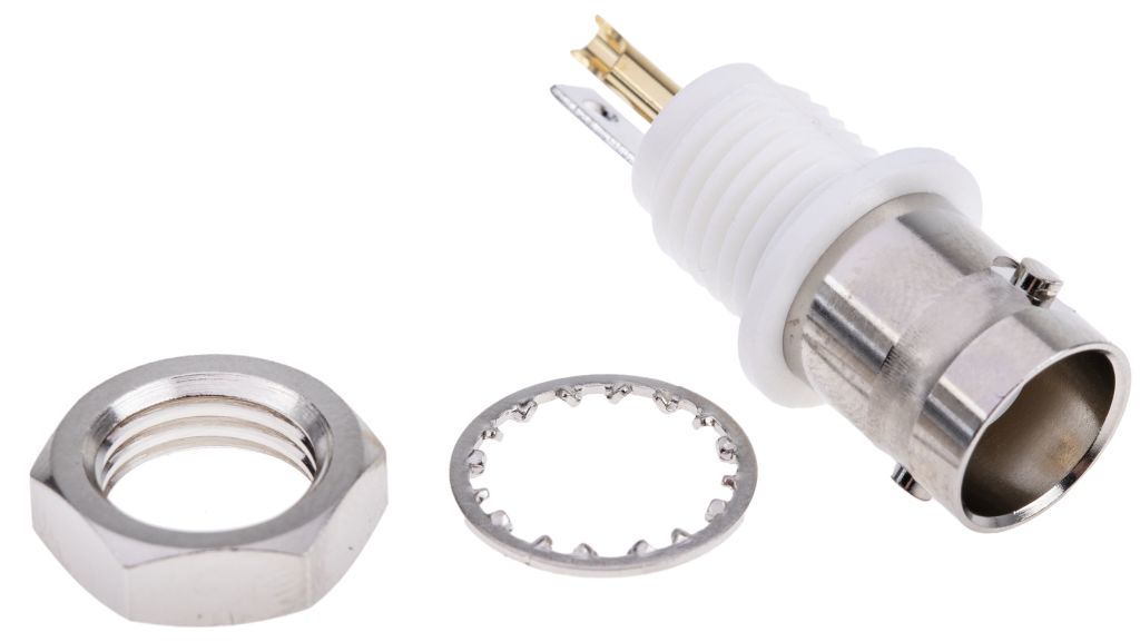 From RS PRO, this BNC coaxial connector is designed for use with coaxial cables, and features a bulkhead and screw on nut for mounting to panels and chassis.