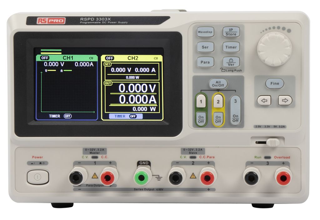RS Pro RSPD3303X (123-6469) and RSPD3303X-E (123-6468) are programmable linear DC power supplies. RSPD3303X has a 5 digits voltage/4 digits current display, 1 mV, 1 mA resolution. RSPD3303X-E has a 4 digits voltage/3 digits current display, 10 mV, 10 mA resolution. The highest resolution of 1 mV/1 mA (SPD3303X) provides excellent setting and read-back accuracy. This ensures accurate output even with very with small changes in voltage or current, which is not possible with a low resolution power supply. RSPD3303X and RSPD3303X-E have a 4.3 inch TFT LCD display, support remote programming and have a real time wave display. There are three isolated outputs, two adjustable channels and one selectable channel from 2.5 V, 3.3 V and 5 V. Series and parallel functions allow for combining two channels into one output with more power output capability, extending the application range. Each of the three channels of power can be turned on or off independently and can also be turned all on or all off. Instrument features include protection against output short and overload.