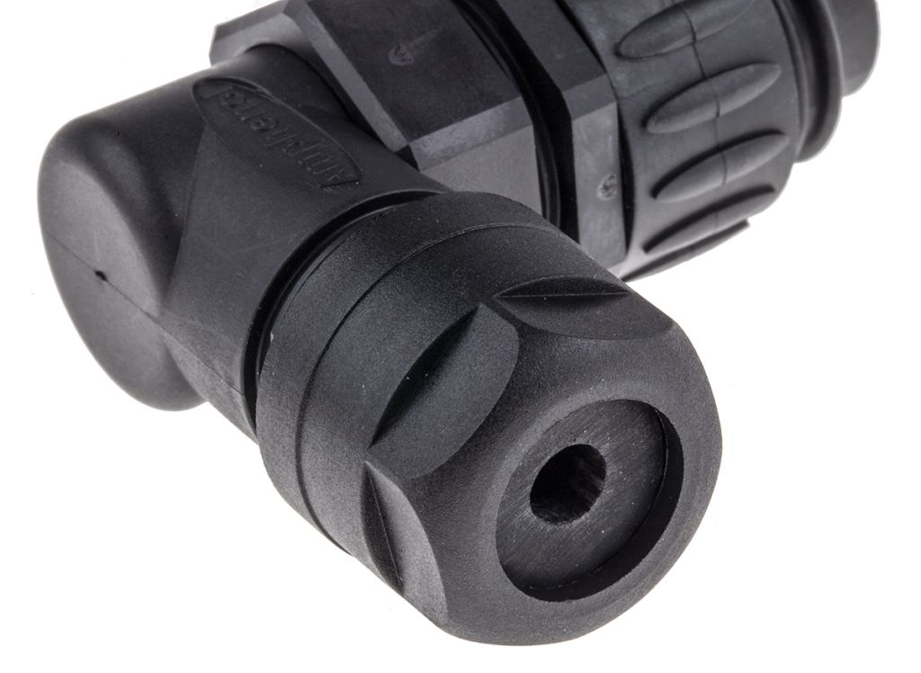 From Amphenol, these right angle Eco Mate series circular connectors have a compact and robust design, with a screw lock connection that meets the high requirements of industrial technology applications. The 90° Eco Mate circular connectors are easy to assemble and are supplied with fittings which include strain relief, mounted gaskets, cable glands and clamping rings. The screwed cable gland has a robust thread for a secure connection.