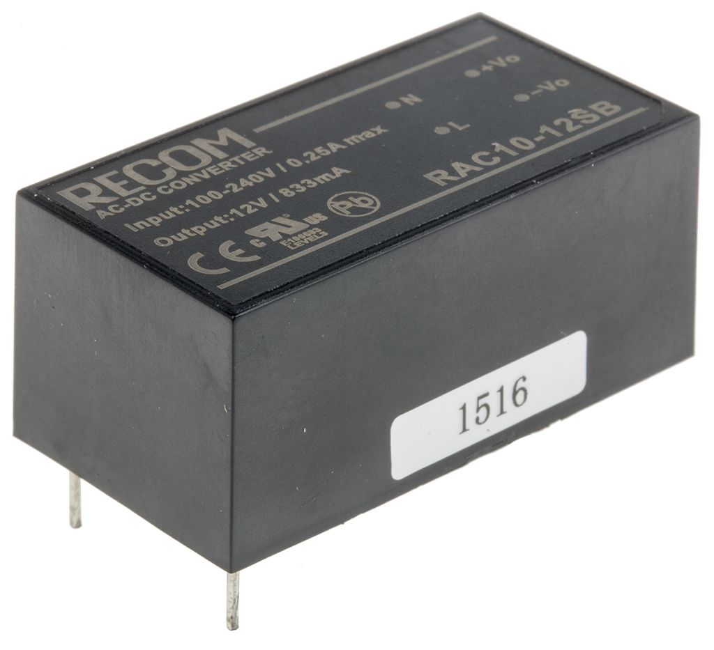 | Product description | Recom Embedded Switch Mode Power Supply SMPS, 12V dc, 833mA, 10W Encapsulated |