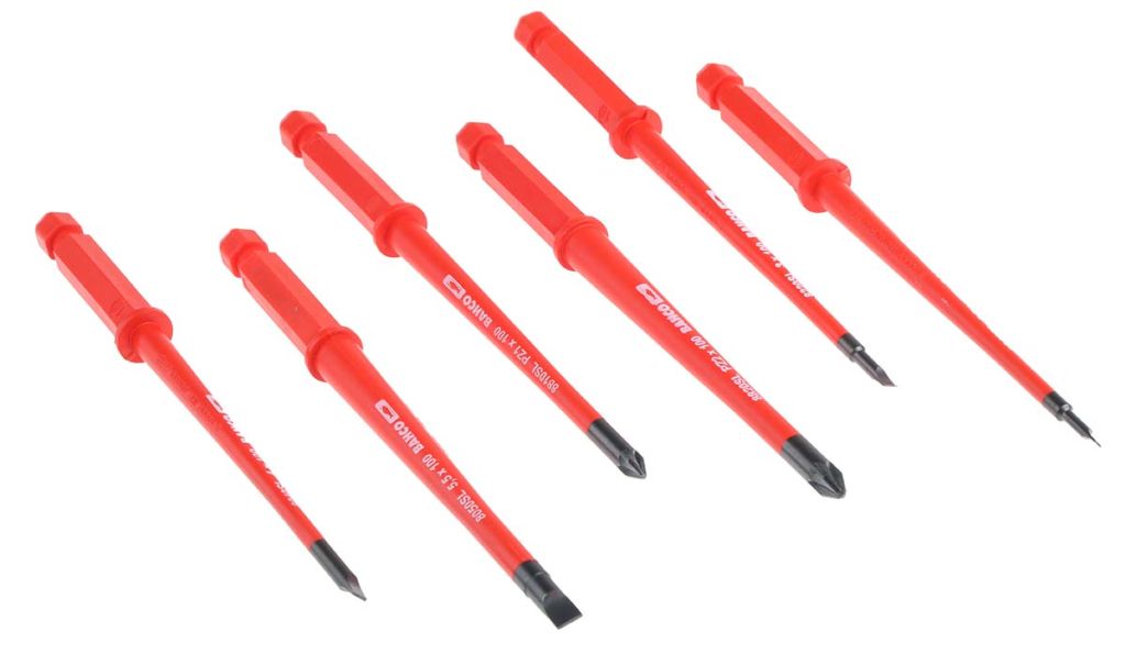 Professional quality 1000 V insulated driver handle and blade set for live working supplied in a nylon pouch.