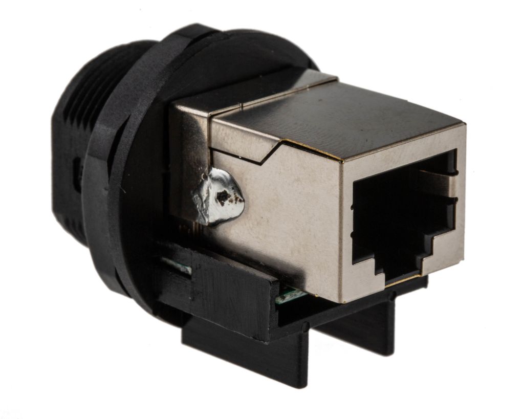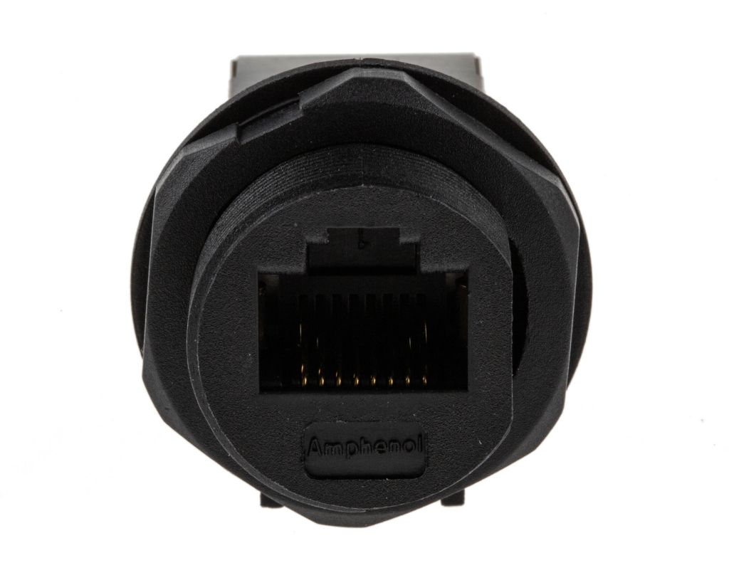 Amphenol IP68 sealed ETHERNET / RJ45 receptacle rear panel mount couplers with plastic shells and a threaded coupling. Stock number 739-8492 is a jam nut receptacles with a 90° RJ45 back terminations, stock number 739-8499 is a jam nut receptacle with a straight RJ45 termination. A panel gasket is also included with these IP68 RJ45 jam nut receptacles.