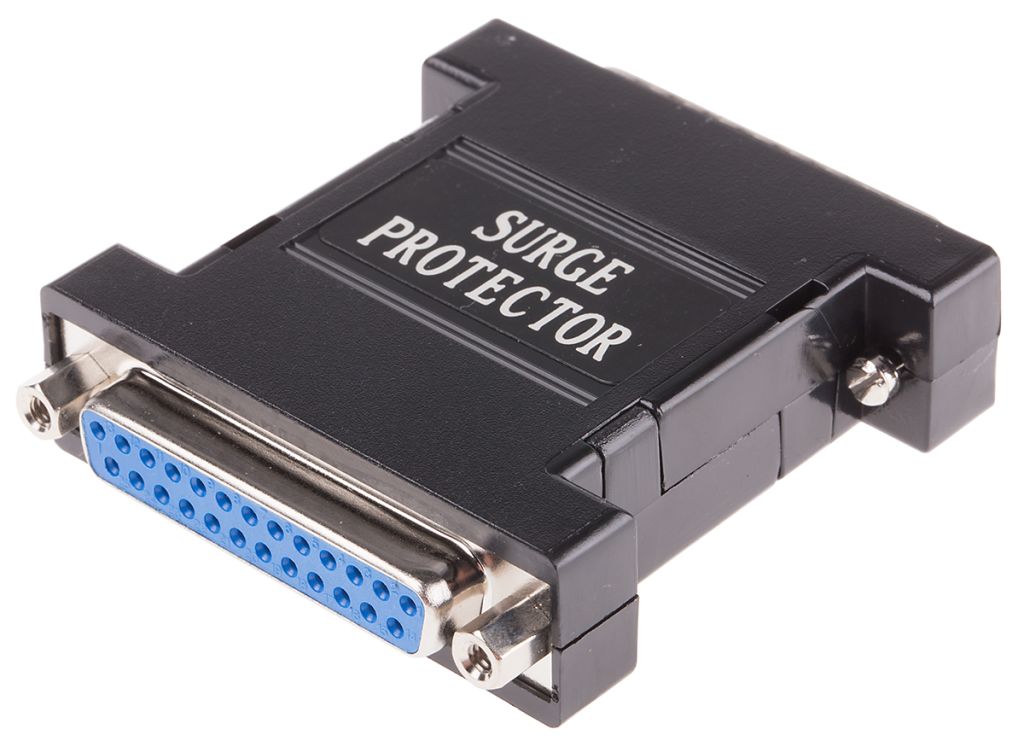 A surge protector designed to protect any RS-232 port from the possibility of low level induced mains voltage transients. The ABS-bodied surge protector uses metal oxide varistors (MOV’s) to protect pins 2, 3, and 7.,It has one male and one female connector with all 25 pins connected straight through. MOV’s are connected between pins 1 and 2, 1 and 3, and 1 and 7. The MOV’s will suppress any voltage above 30 volts without affecting the normal RS-232 operation. The MOV’s are capable of suppressing one joule of energy and 250 A peak current.