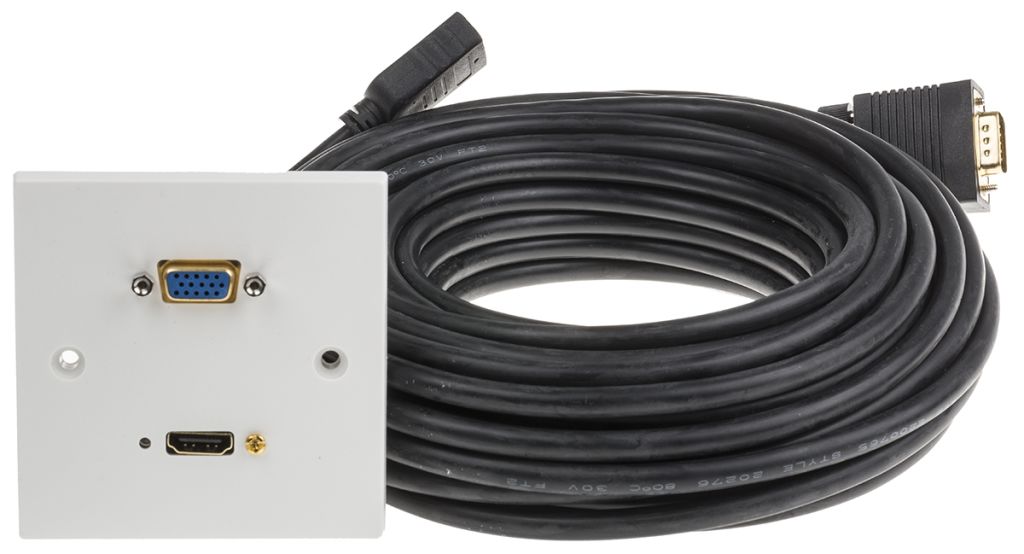 This is a single faceplate with a HDMI and VGA connector. The faceplate comes with female connectors at the front and male connectors on the opposite end of the cable. These are ideal for you to connect a range of devices while running cables behind walls. The single gang unit will fit standard size electrical back boxes.