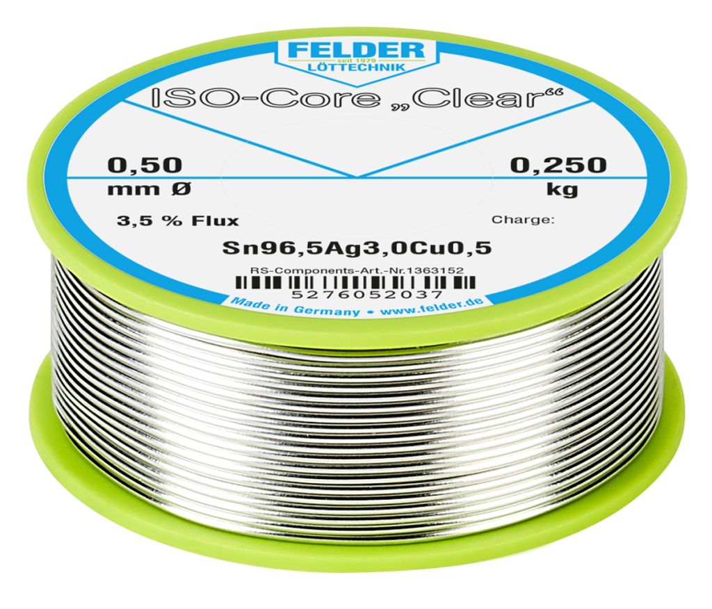 ISO-Core Clear Sn96, 5Ag3Cu0, 5 is a lead free solder wire which excellent for use within electronic, electro-mechanics and electro-technic applications. The flux has a high temperature resistance and there is so spattering during soldering. Excellent spreading value and optimum wetting plus the brilliance of the solder joints ensure that you are working with a top quality cored solder wire.