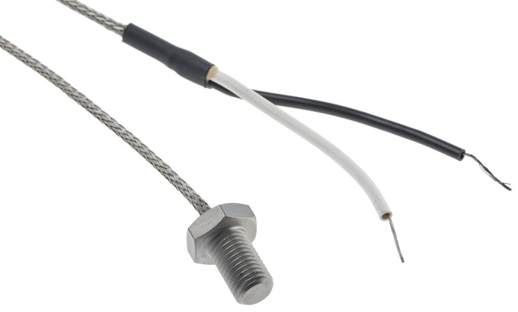 Bolt thermocouples with 2m of glass fibre stainless steel overbraided cable, available in type K or J. Bolt sensors are generally screwed into the surface which normally increases the speed of response and sensitivity of the measurement.